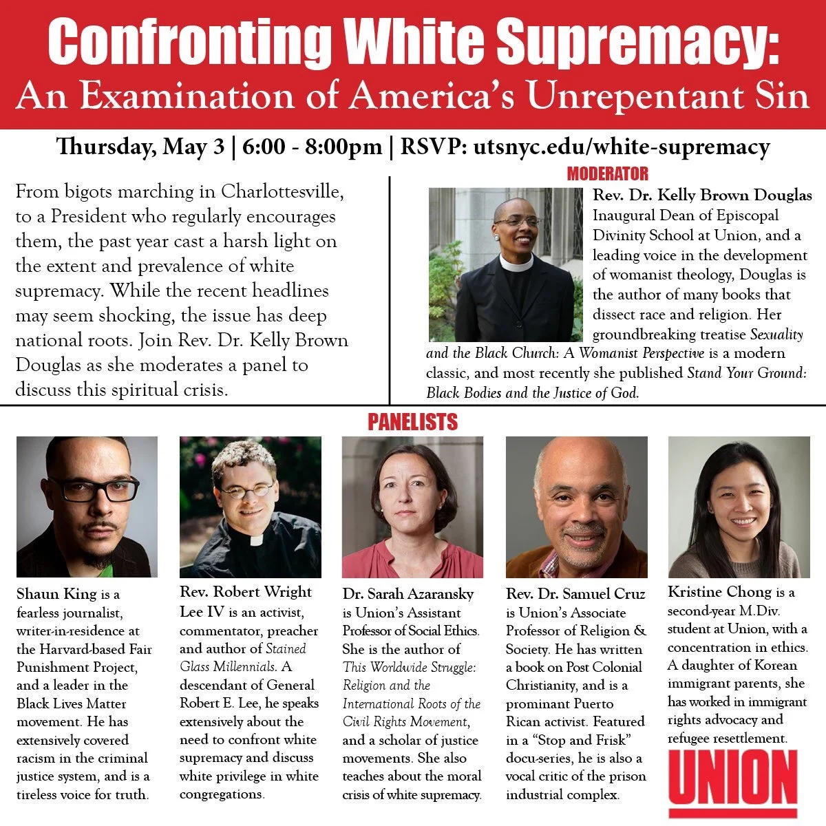 From bigots marching in Charlottesville, to a President who regularly encourages them, the past year cast a harsh light on the extent and prevalence of white supremacy. While the recent headlines may seem shocking, the issue has deep national roots. Join Rev. Dr. Kelly Brown Douglas as she moderates a panel to discuss this spiritual crisis.
